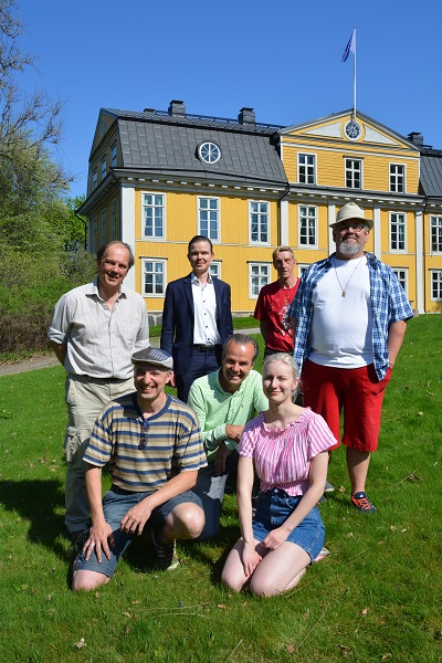 Käsikirjoittaja Jan Lindroos (vas), ohjaaja Marko Kokko, näyttelijä Janne Jurvanen, Mustion Linnan isäntä Filip Linder ja näyttelijät Sanna Salán, Jorma Haapasaari ja Tommy Haakana.