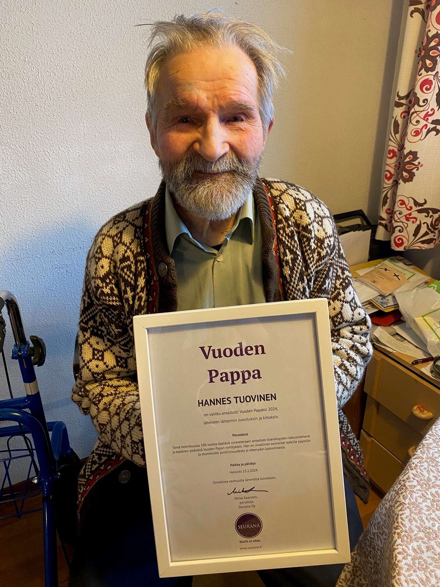 Hannes Tuovisen ilmoitti Vuoden Pappa 2024 -tunnustukseen naapurinsa. Naapuri kertoi, miten ”Tämä helmikuussa 100 vuotta täyttävä sotaveteraani ansaitsee itsenäisyyden takuumiehenä ja kaikkien ystävänä tämän nimityksen”. Tutustuttuamme Hannekseen ja hänen poikaansa ja kuultuamme Hanneksesta tarinoita, oli valinta yksimielinen.
