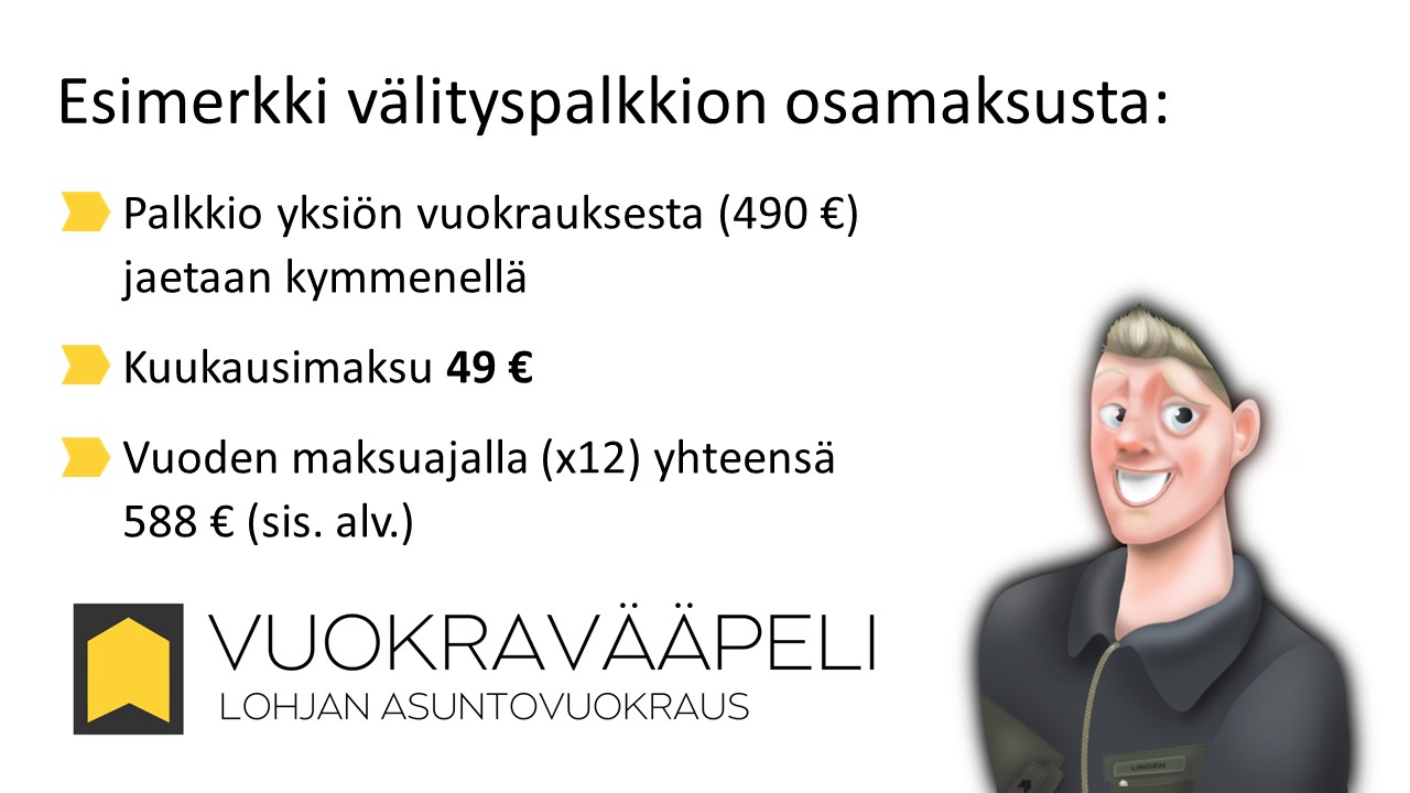 Moni saattaa kokea välityspalkkion liian suurena kulueränä kerralla maksettavaksi, ja hoitaa tämän takia vuokrauksen itse, vaikka muutoin mielellään homman ammattilaiselle ulkoistaisi. Mutta meillä on tähän ratkaisu!