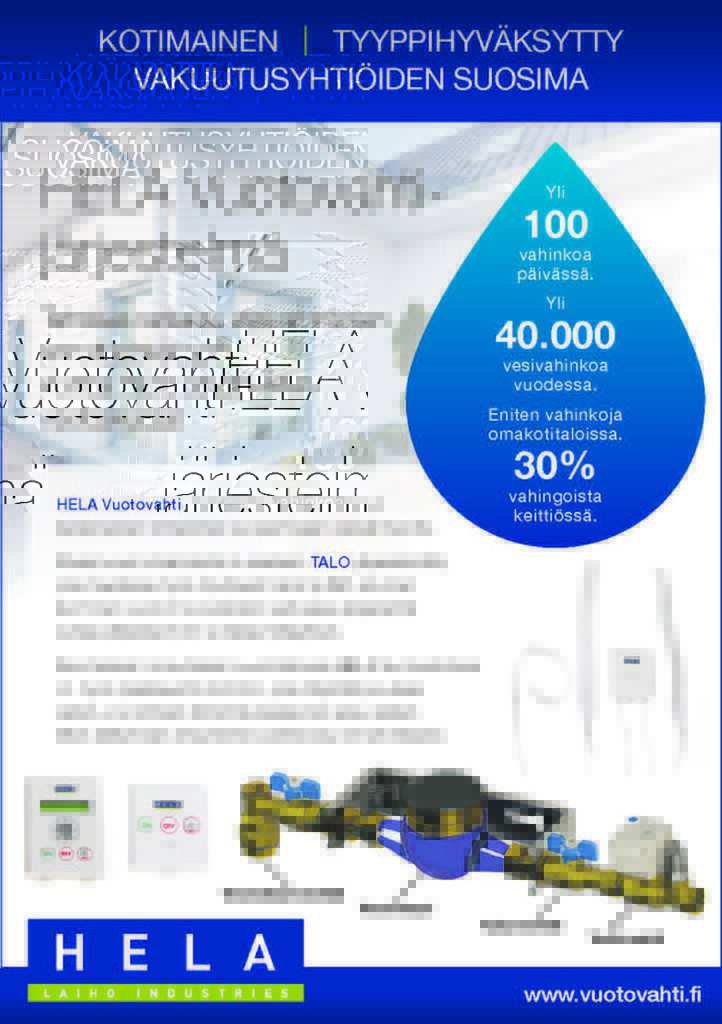 Todelliseen tarpeeseen Heikki Laiho Oy kehitti myös uuden HELA Vuotovahdin. Laitteen, joka on suunni- teltu estämään vesivahingot havaitsemalla putkiston piilovuodot, vuotavat letkut, liitokset ja hanat. Raken- teisiin pääsevä vesi aiheuttaa homevaurioita, jotka tuovat mukanaan terveyshaittoja mittavista korjaus- kustannuksista puhumattakaan. Rikkoutuvan putken aiheuttamat tulva-aallot voi nyt unohtaa – HELA Vuotovahti ei vain hälytä ongelman löytyessä vaan katkaisee rakennuksesta käyttöveden kokonaan.