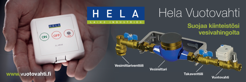 Julkisissa rakennuksissa, toimisto- ja liikerakennuk- sissa sekä tuotanto- ja teollisuuslaitoksissa, jotka ovat täynnä tekniikkaa, vesivahingosta koituvat kustannuk- set hipovat pilviä. Vesipisteitä on paljon, mutta niiden valvonta ja tarkastus on harvoin nimetty kenenkään vastuulle. HELA Vuotovahti on ensimmäinen järjes- telmä, joka palvelee myös yritysten ja julkisten raken- nusten tarpeita. Laiho muistuttaa, ettei Vuotovahti– tai mikään olemassa oleva järjestelmä – voi estää puhki kuluneen putken rikkoutumista, mutta järjes- telmän asentaminen on pieni vaiva ja kustannus ver- raten tilanteeseen, jossa käyttövesiputki pamahtaa rakennuksen ollessa tyhjillään.