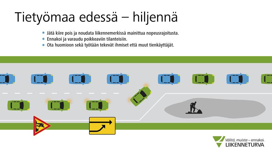 ”Opasteille ja rajoituksille on syynsä, kyse ei koskaan ole kiusanteosta. Rajoitusten noudattamatta jättäminen tekee tiet vähemmän turvallisiksi meille kaikille. Kyse ei ole vain tielläliikkujien, vaan myös tietyömaan työntekijöiden turvallisuudesta. He tekevät hommia, jotta yhteydet paranisivat ja liikenne olisi jatkossa yhä sujuvampaa. Tietyömaa-alueella on tärkeintä hidastaa ajonopeus sellaiseksi, että voi varautua poikkeaviin tilanteisiin”, korostaa Liikenneturvan aluepäällikkö Rainer Kinisjärvi.