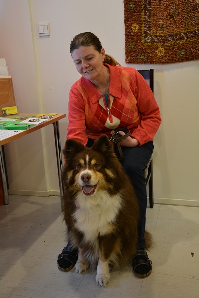 Juuri tukikoirakurssin käynyt lapinkoira Luca ja Lohjan seudun mielenterveysseuran toiminnanjohtaja Cati Järnmark-Mårdh.